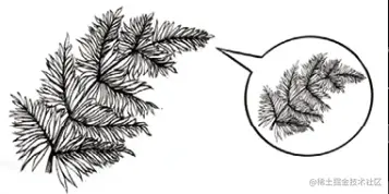 在现实世界中,某些具有从属关系的事物之间存在着一定的相似性。大家一定见过蕨类植物的叶子吧。如图所示,从宏观上看,这只是一片普通的叶子,当继续观察其中一个分支的时候,我们会发现这个分支其实又是一片全新的叶子,当我们再继续观察这片新叶子的一个分支的时候,又会得到相同的结果