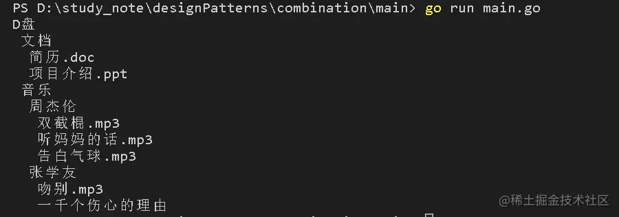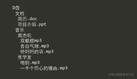 正如我们规划文件时常做的操作,用户以“D盘”文件夹作为根节点构建了目录树,接着开始创建了“文档”和“音乐”两个文件夹作为“枝”节点,再将相应类型的文件分别置于相应的目录下,其中对音乐文件多加了一级文件夹来区分歌手,以便日后分类管理、查找。如此一来,只要能持有根节点对象“D盘”,就能延伸出整个目录