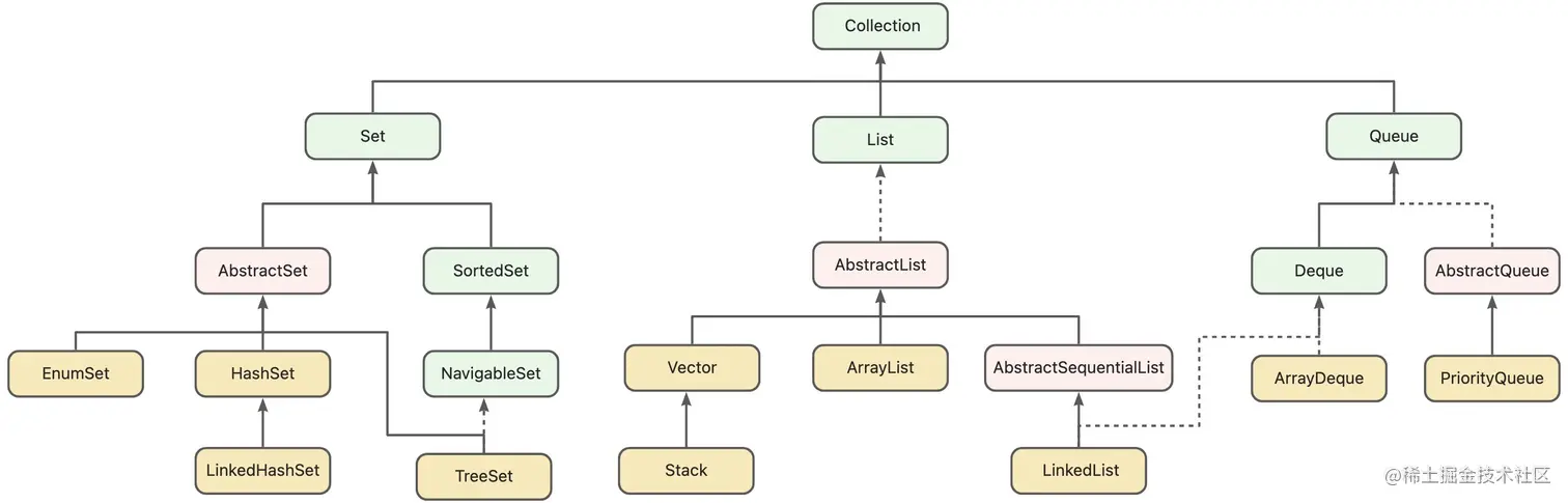 Java 集合, 也叫作容器,主要是由两大接口派生而来:一个是 Collection接口,主要用于存放单一元素;另一个是 Map 接口,主要用于存放键值对。