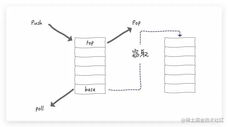 而当某个线程对应的队列空闲时,该线程则去队列的底部(base)窃取(poll)任务到自己的队列,然后进行消费。那问题来了:为什么不从头部(top)获取任务,而要从底部(base)获取任务呢? 那是为了避免冲突!如果两个线程同时从顶部获取任务,那就会有多线程的冲突问题,就需要加锁操作,从而降低了执行效率。