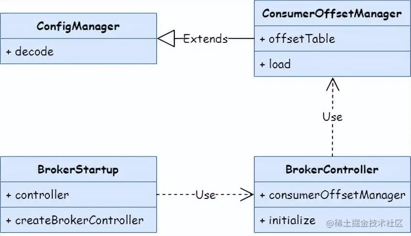 在 Broker 初始化时,会加载本地的偏移量文件,调用关系的 UML 类图如下: