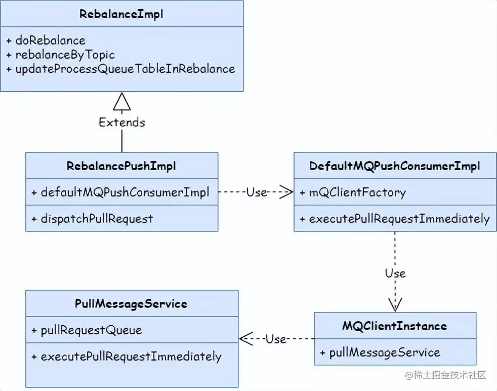 RocketMQ 客户端启动的时候,会启动重平衡线程 RebalanceService,在这里创建拉取消息的请求。下面 UML 类图展示了客户端启动重平衡线程的调用关系: