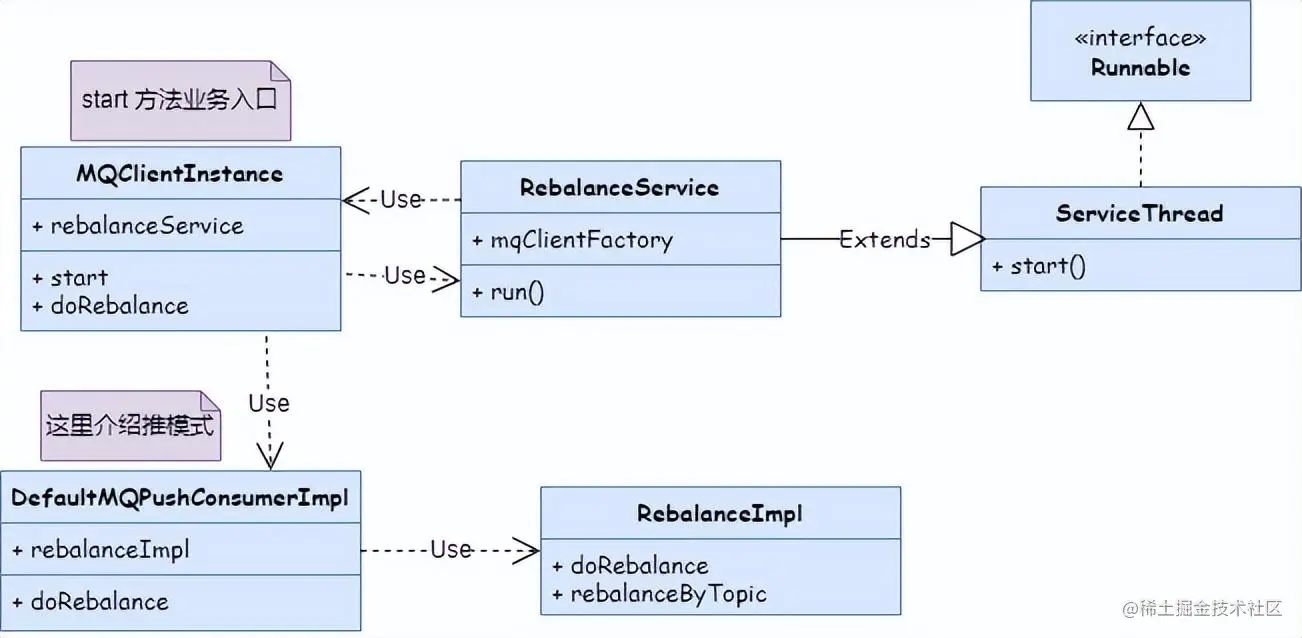 业务入口是 MQClientInstance 中的 start 方法,start 方法中启动了 RebalanceService 线程,线程中的 run 方法又返回来调用了 MQClientInstance 中的 doRebalance 方法,最终调用到了 RebalanceImpl 中的 doRebalance 方法。