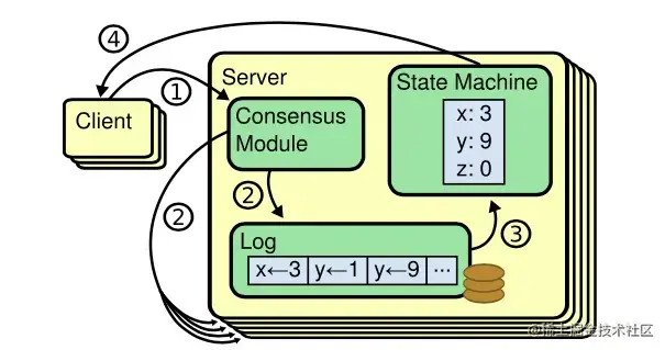 如何保证复制日志一致就是一致性算法的工作了。在一台服务器上,一致性模块接受客户端的命令并且把命令加入到它的日志中。它和其他服务器上的一致性模块进行通信来确保每一个日志最终包含相同序列的请求,即使有一些服务器宕机了。一旦这些命令被正确的复制了,每一个服务器的状态机都会按同样的顺序去执行它们,然后将结果返回给客户端。最终,这些服务器看起来就像一台可靠的状态机。