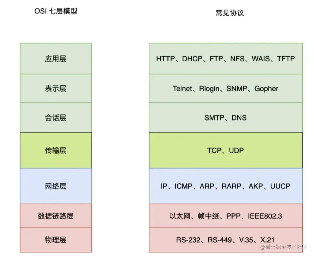 从下往上看,第四层为传输层、第七层为应用层。再来看看每层对应的常见协议: