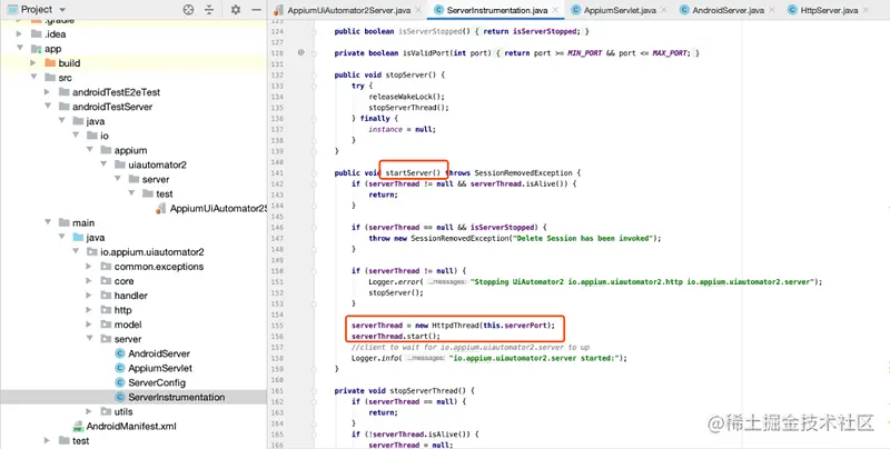startServer( ) 方法就是它的启动入口函数。这个函数里面调用了 ServerInstrumentation 类里面的 startServer( ) 方法。如下图: