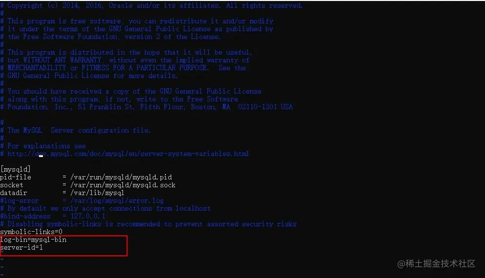 vim mysqld.cnf #修改cnf文件,添加 server-id 表示master服务标识,同一局域网内注意要唯一 和 log-bin=mysql-bin 开启二进制日志功能,可以随便取,用来完成主从复制