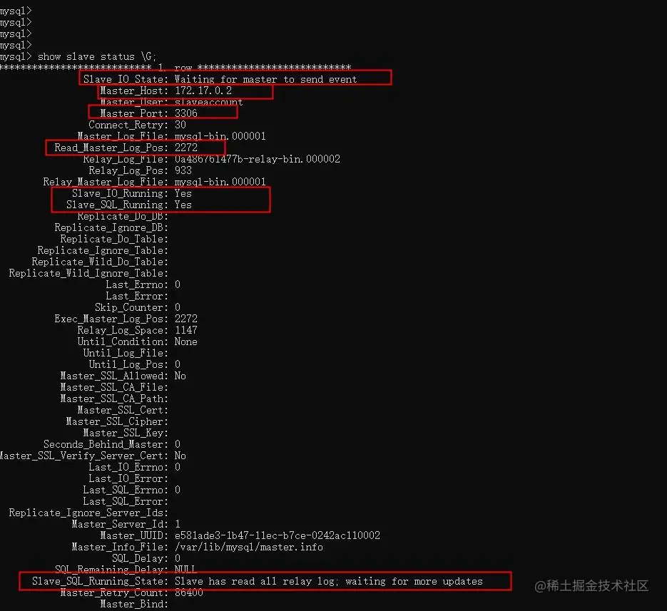 change master to master_host='172.17.0.2', master_user='slaveaccount', master_password='654321', master_port=3306, master_log_file='mysql-bin.000001', master_log_pos=2272, master_connect_retry=30;