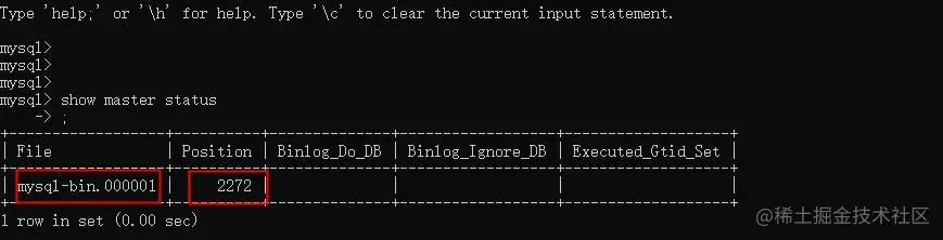 记录下上的position和file 在创建MySQL slave配置时会用到