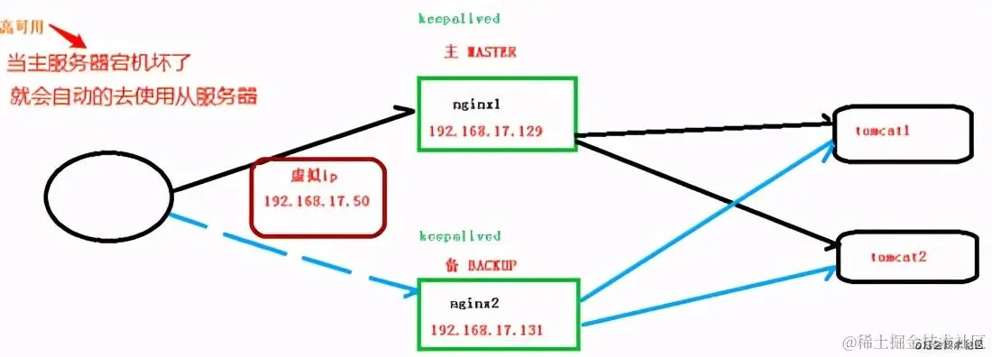 (2)需要 keepalived 软件;类似于路由,里面通过脚本来检查当前的 主服务器的nginx(主nginx) 是否还活着,如果活着就用,如果宕机死了,就去使用 从服务器的nginx(备份的nginx) ,在这个过程中,该软件会向外提供一个虚拟IP,这个IP实际是不存在的,但是我们需要用这个虚拟IP去访问