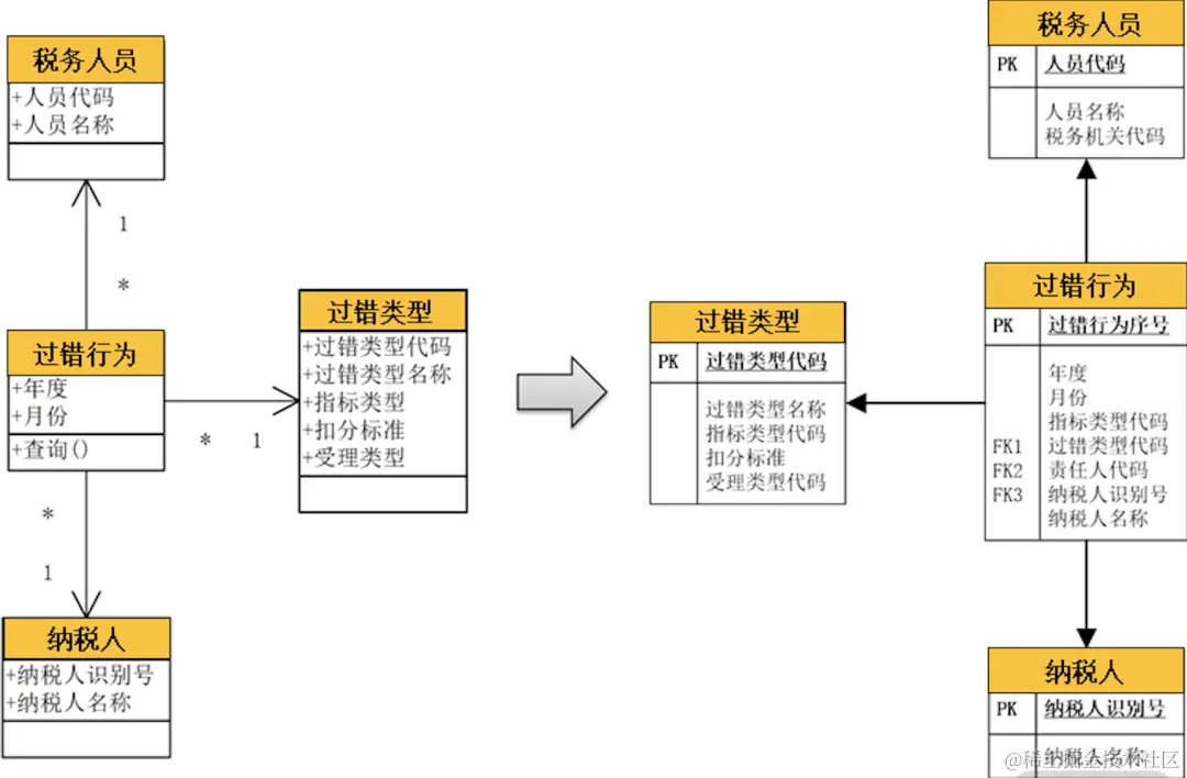 也就是说,join 操作往往是关系型数据库在面对大数据时最大的瓶颈之一。因此,一个更好的方案就是先查询过错行为表,分页,然后再补填当前页的其他关联信息。这时,就需要在“过错行为”这个值对象中通过属性变量,增加对税务人员、纳税人与过错类型等信息的引用。