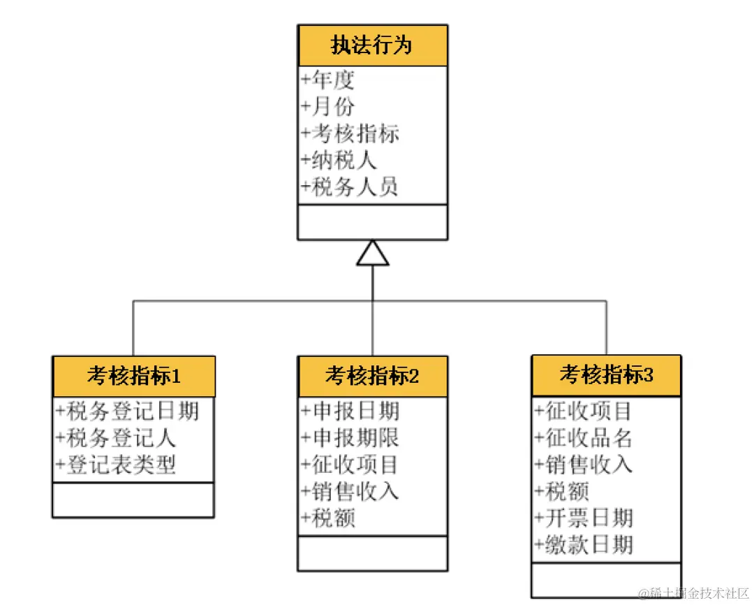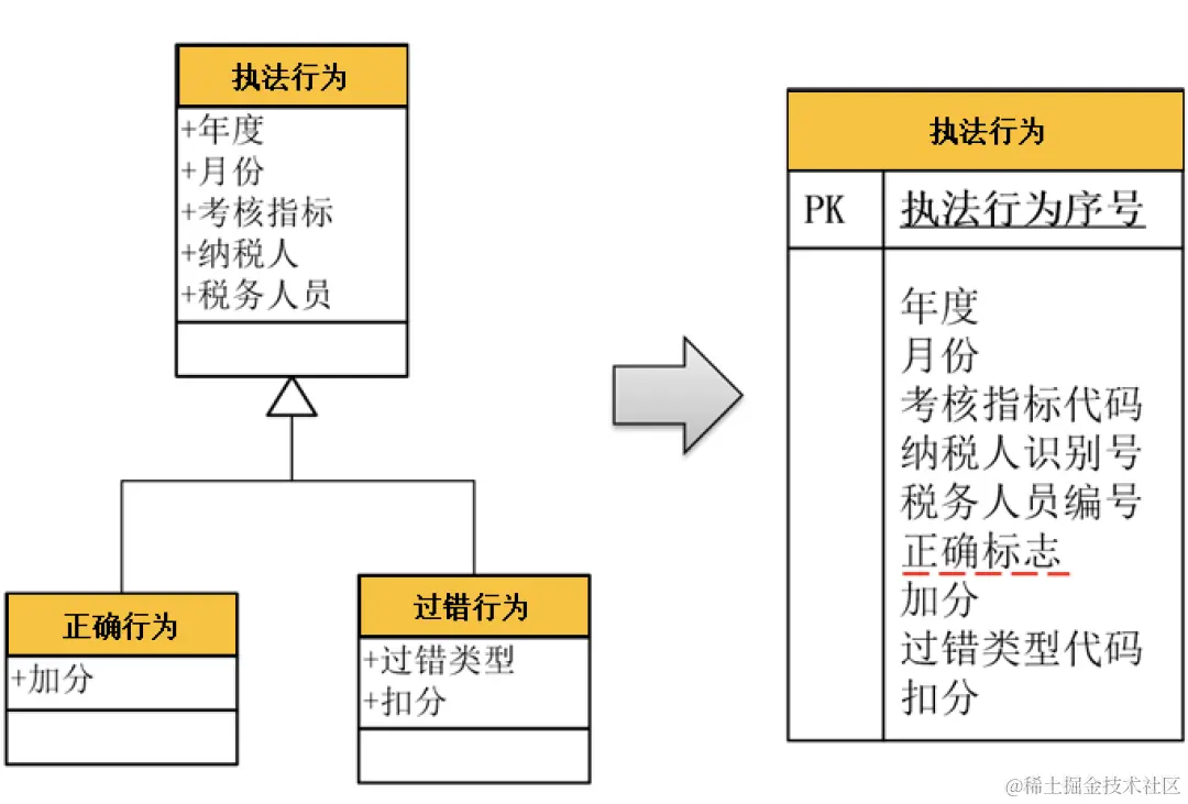 首先,看看以上案例。“执法行为”通过继承分为“正确行为”和“过错行为”。如果这种继承关系的子类不多(一般就 2 ~ 3 个),并且每个子类的个性化字段也不多(3 个以内)的话,则可以使用一个表来记录整个继承关系。在这个表的中间有一个标识字段,标识表中的每条记录到底是哪个子类,这个字段的前面部分罗列的是父类的字段,后面依次罗列各个子类的个性化字段。