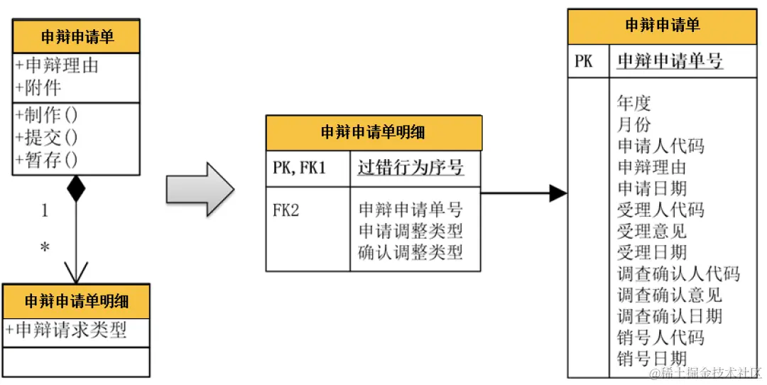 该关系往往表达的是一种主-子表的关系。譬如,以上案例中的“申辩申请单”与“申辩申请单明细”就是一对“一对多”关系。除此之外,订单与订单明细、表单与表单明细,都是一对多关系。一对多关系在数据库设计上比较简单,就是在子表中增加一个外键去引用主表中的主键。比如本案例中,申辩申请单明细表通过一个外键去引用申辩申请单表中的主键,如下图所示。