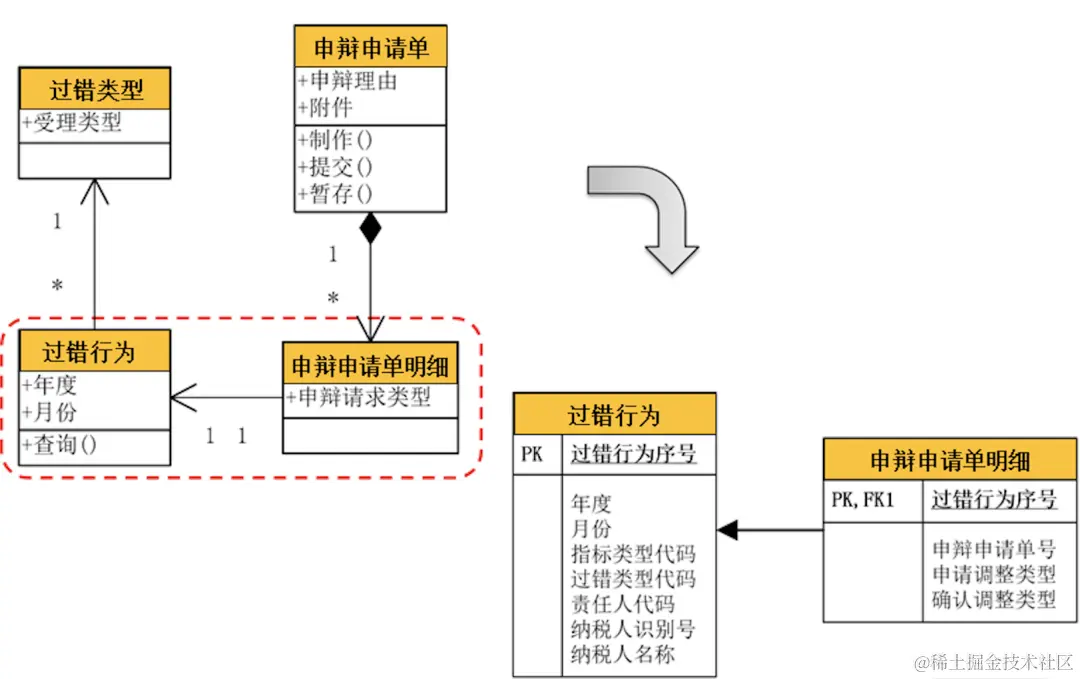 上图是一个绩效考核系统的领域模型图,该绩效考核系统首先进行自动考核,发现一批过错,然后再给一个机会,让过错责任人对自己的过错进行申辩。这时,过错责任人可以填写一张申辩申请单,在申辩申请单中有多个明细,每个明细对应一个过错行为,每个过错行为都对应了一个过错类型,这样就形成了一个领域模型。