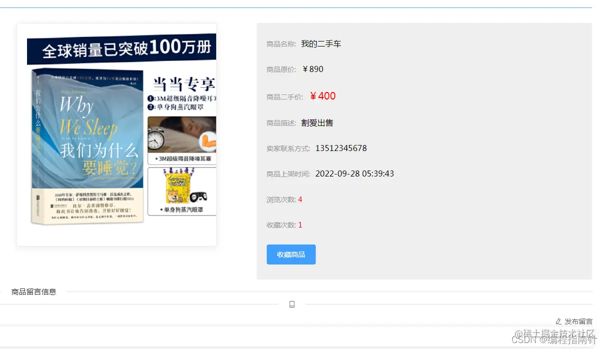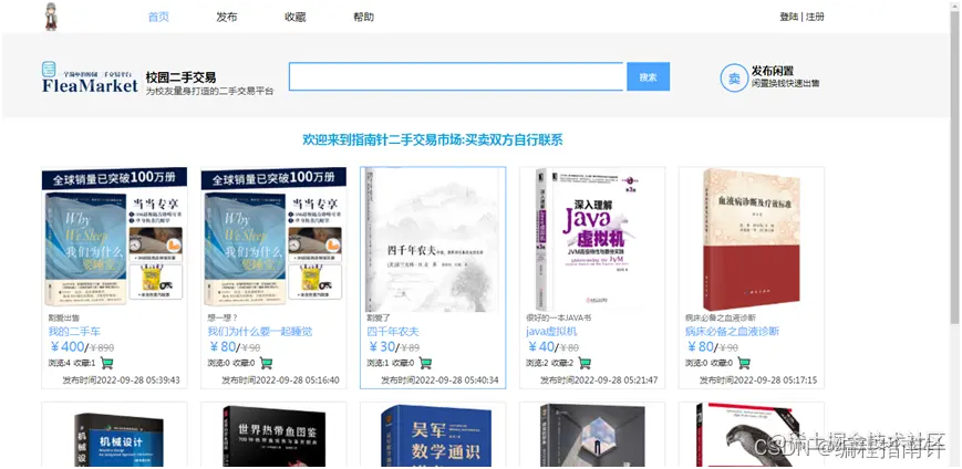 本项目基于springboot+vue实现了一个前后端分离模式的校园二手交易平台。校内师生可以在此平台上注册自己的账户,然后发布自己想要处理的二手物品,平台本身不实现在线交易功能,发布的二手物品由买卖双方自行联系进行线下交易。主要实现的功能有用户注册、登陆、发布商品、收藏商品、统计浏览量和收藏量、在线留言、全文检索、管理个人发布的商品和留言等功能。系统功能完整,业务模式清晰,开发结构简单,比较符合目前后端分离模式开发的主流诉求,可以用作毕业设计或课程设计以及期未作业使用。