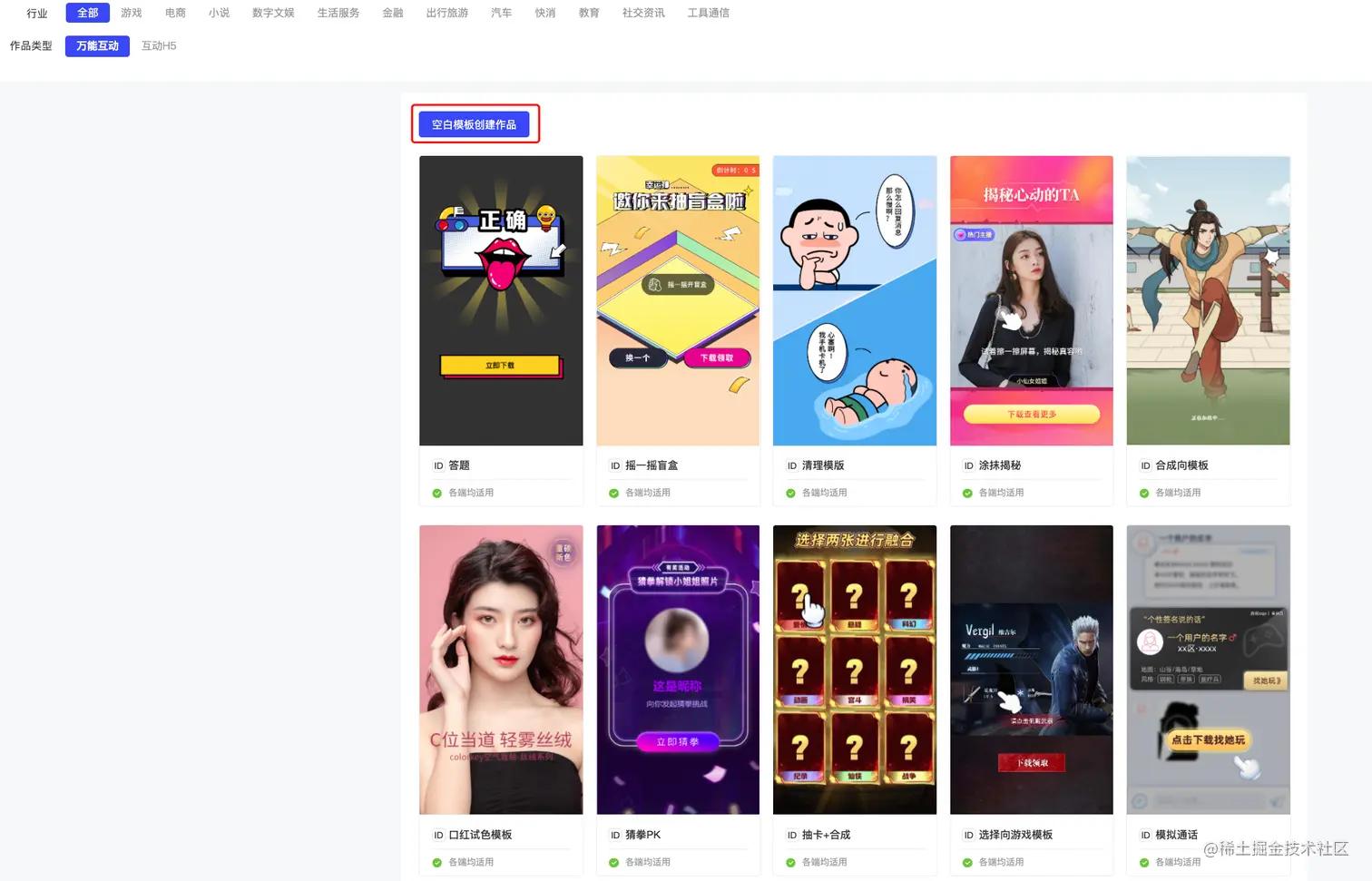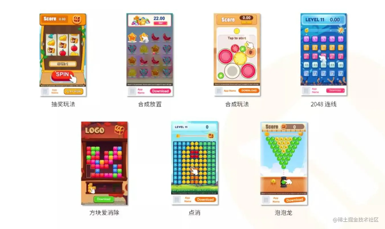 1.平台在线模板达数百种,涵盖了市面上常见的交互玩法和广告风格,并且模板持续更新,能够满足不同应用类型和应用场景对素材的需求。Playturbo 提供的可玩广告与交互式 Endcard 模板,就涵盖了合成、点消、融合、2048 连线、养成等多个交互玩法。