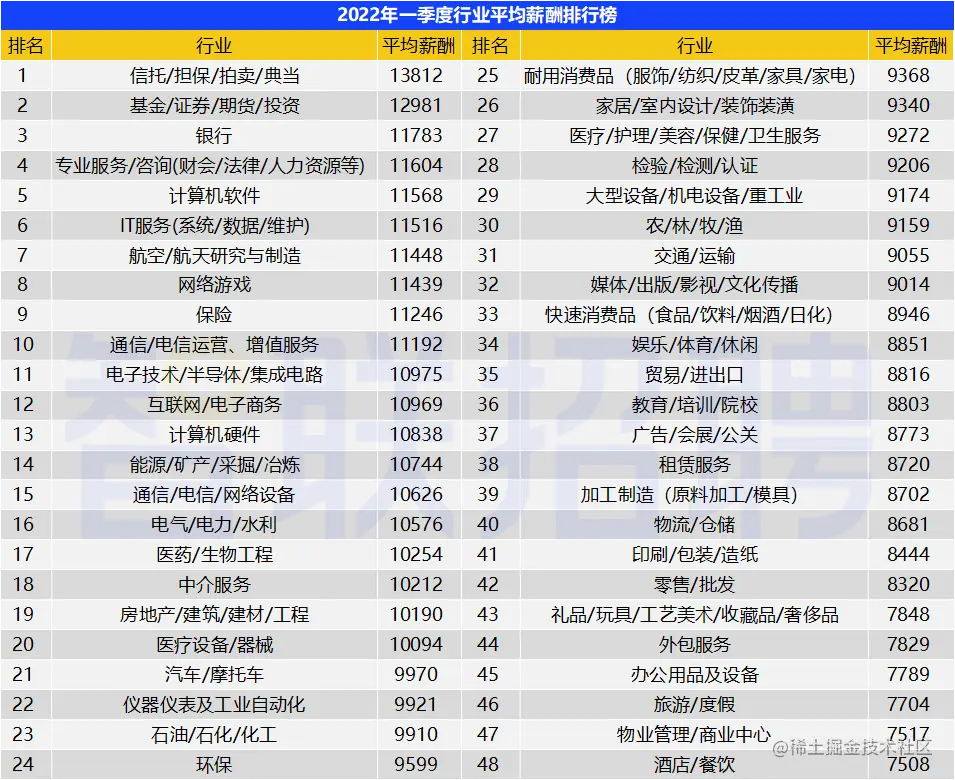 下面是2022年的薪酬排行榜,IT服务依然前列,这个形势并没有太多变化。