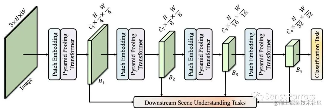 在计算机视觉领域中应用transformer技术的关键困难在于如何使计算注意力关系的过程更加高效。Wu等[3]利用金字塔池化,设计了基于的金字塔池化的MHSA(pooling-based MHSA, P-MHSA)。金字塔池化作为计算P-MHSA中降低序列长度的基本操作。使用P-MHSA替换掉MHSA后,即为P2T基础模块。通过堆叠不同数量的P2T基础模块,设计了P2T-Tiny/Small/Base/Large骨干网络,分别对应ResNet-18/50/101/152。在图像分类、语义分割、目标检测、实例分割等多个领域中,P2T均取得了比现有CNN/Transformer骨干更优异的性能。