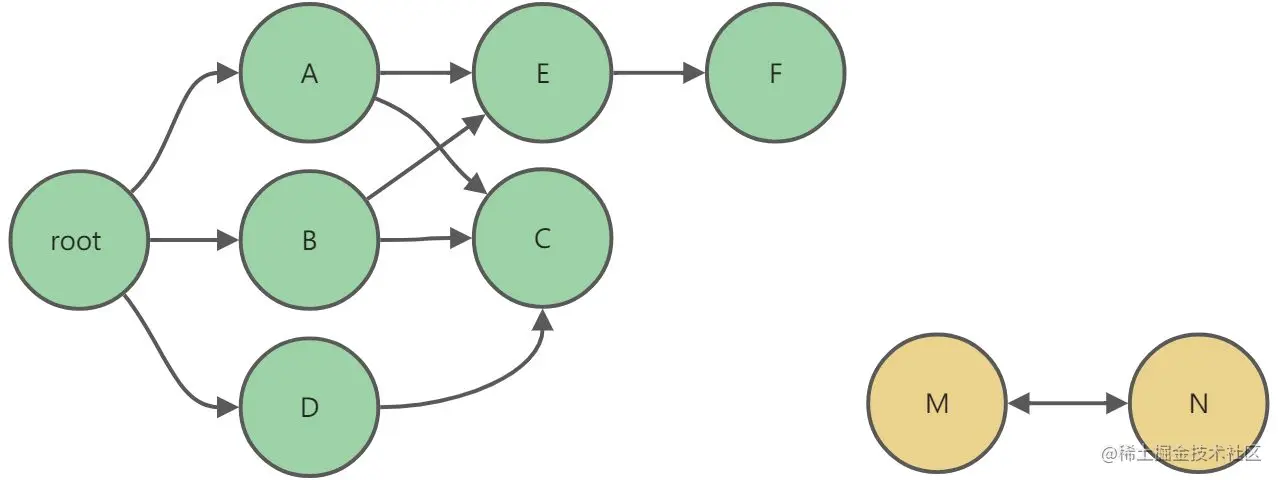 - 这个算法会设置一个根对象(root object),垃圾回收器会定时地从这个根对象开始,找到所有从根对象开始有引用到的对象,对于哪些没有引用到的对象,就认为是不可用的对象;