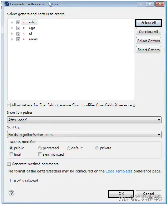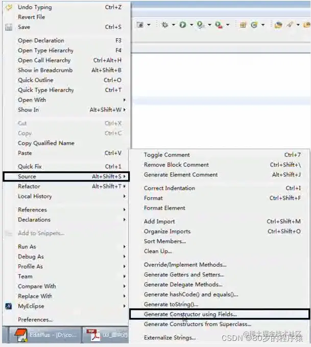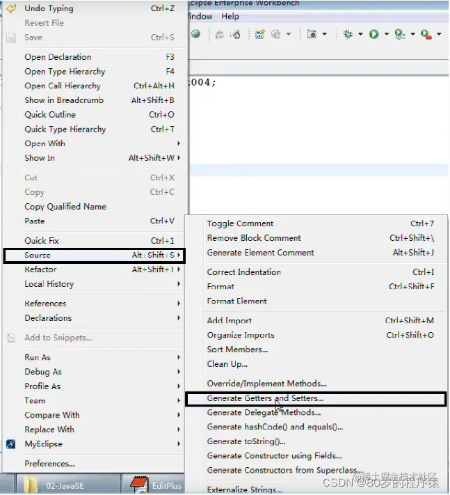 而在eclipse中get和set方法不用写,直接按下面操作自动生成get,set方法