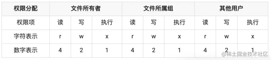 针对文件所有者、文件所属组、其他用户进行权限分配,其中类型又分成读、写和执行,具备权限位4、2、1,不具备权限为0