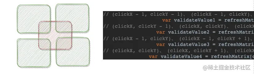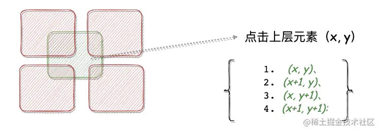 在不考虑特殊情况的前提下点击上层(x, y),我们需要校验直接(注意:每次我们只需要关心直接下层即可)下层的(x,y)(x+1,y) (x, y+1), (x+1, y+1)