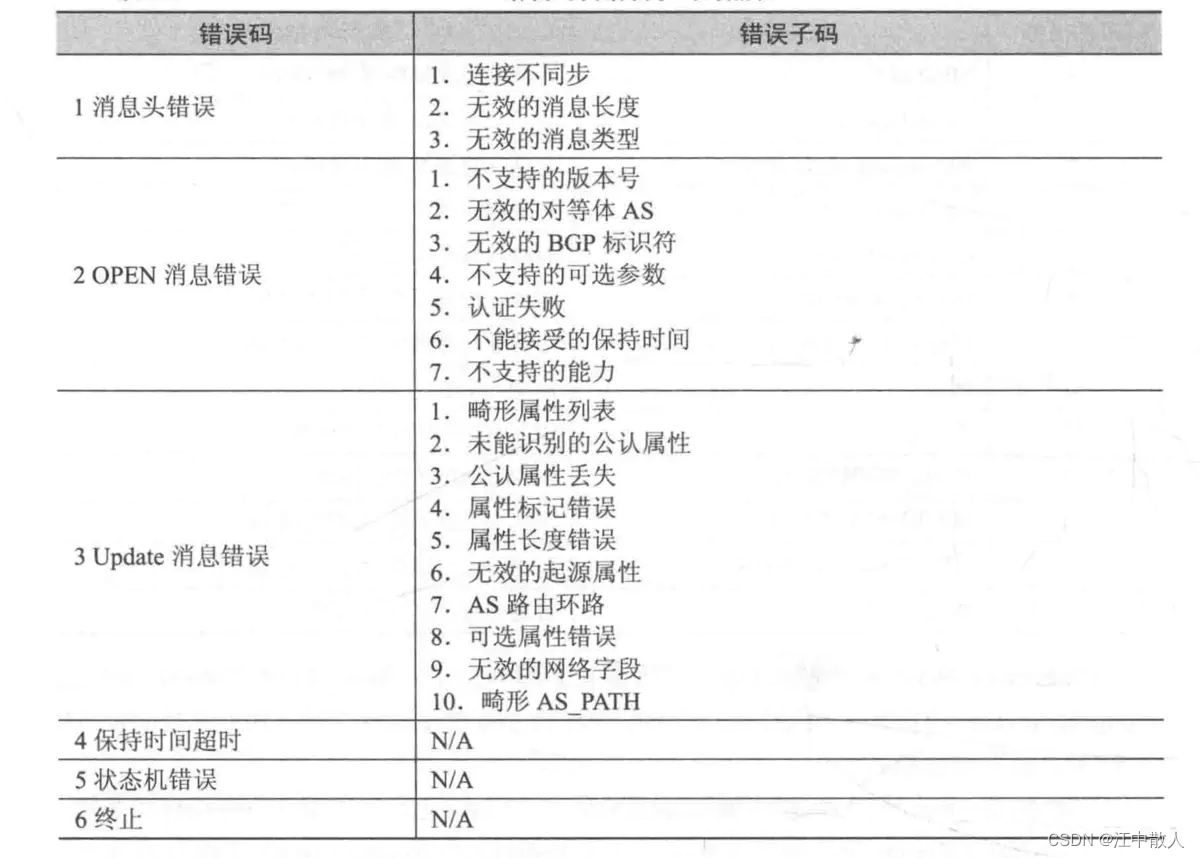 Notification报文,用于错误信息通告,然后断开 BGP邻居。Notification报文由错误代码、错误子代码以及数据字段构成。