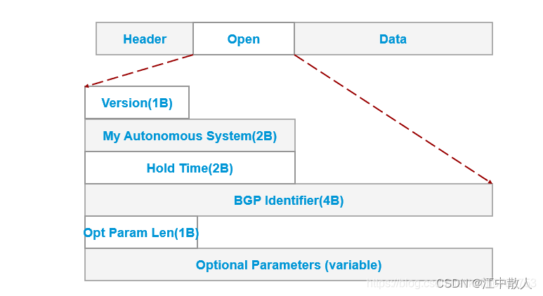- 通过TCP建立BGP连接时,发送OPEN消息;