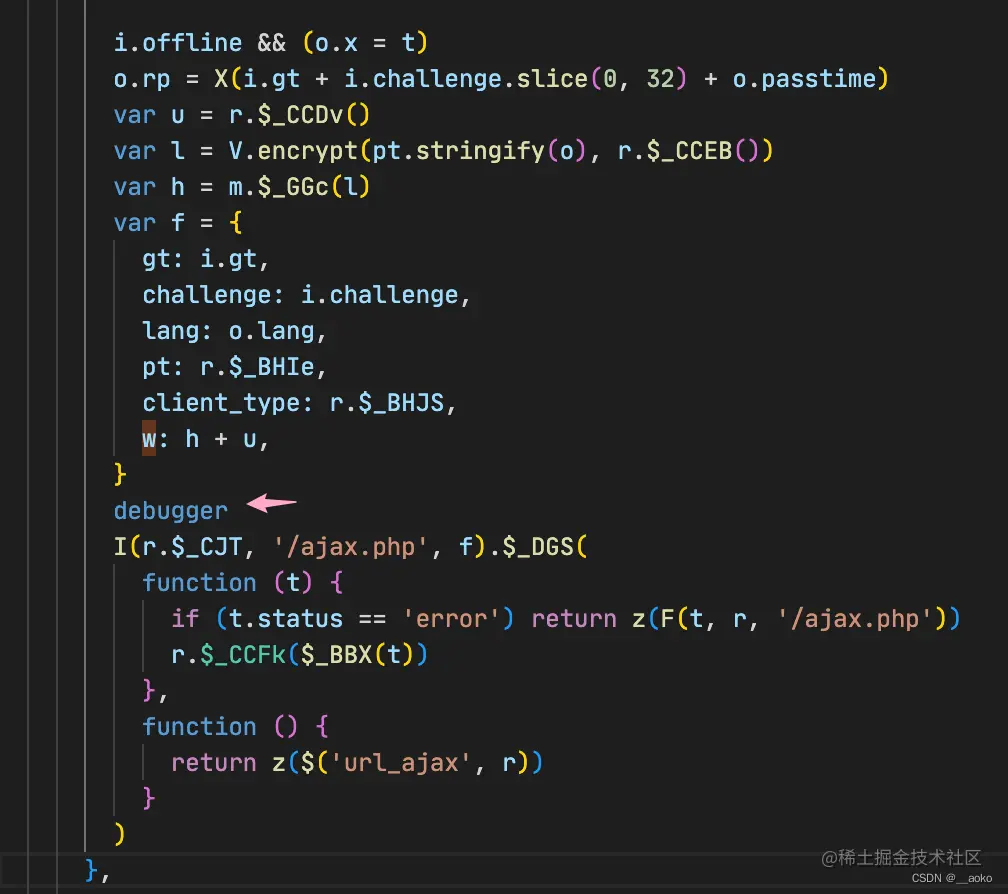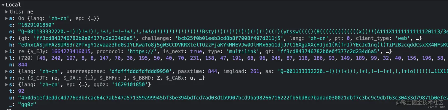userresponse对应的t参数,也就是这里的u参数,我们添加额外的 debugger,结合上述操作步骤,我们发现它其实是滑块的滑动距离,同时challenge字段确实就是接口返回到的challenge字段。对于