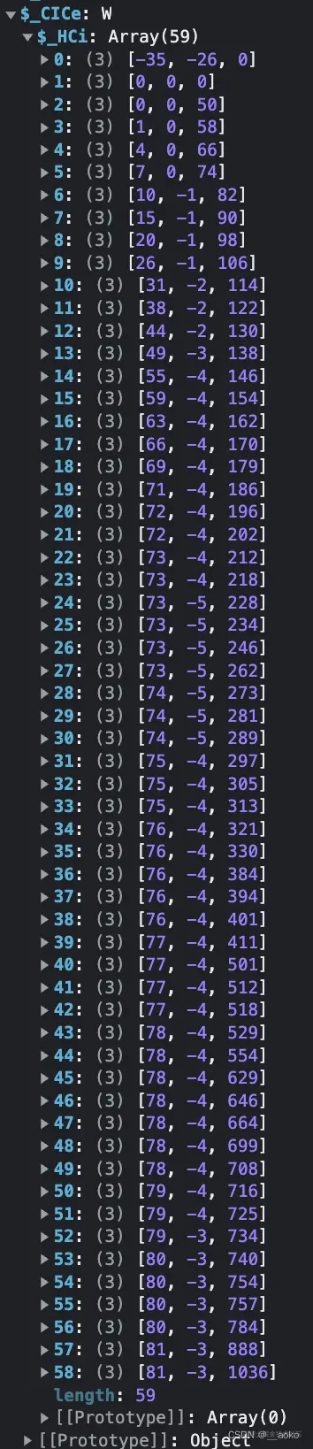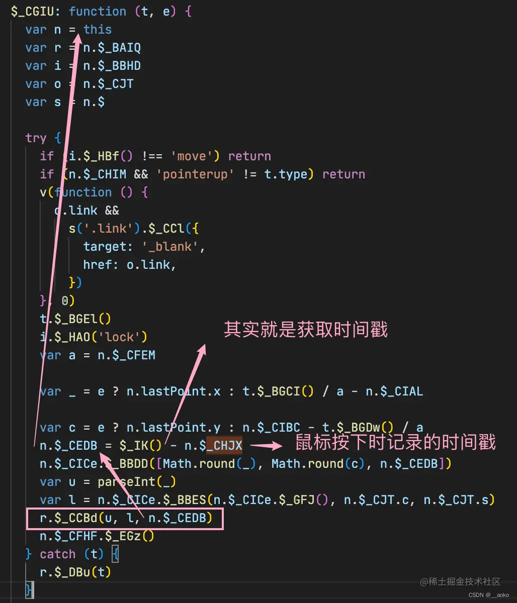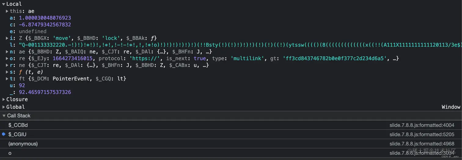 aa对应的e参数,也就是这里的l参数,我们通过观察代码,结合 debugger 数据可以发现,里面c和s是来自于接口的c和s字段,_BBES是固定的函数,同样也是复制下来即可。不过里面的$_GFJ()部分有些特殊,通过断点我们发现里面涉及到一个大数组。这个大数组其实是对鼠标拖动滑块的轨迹的记录。