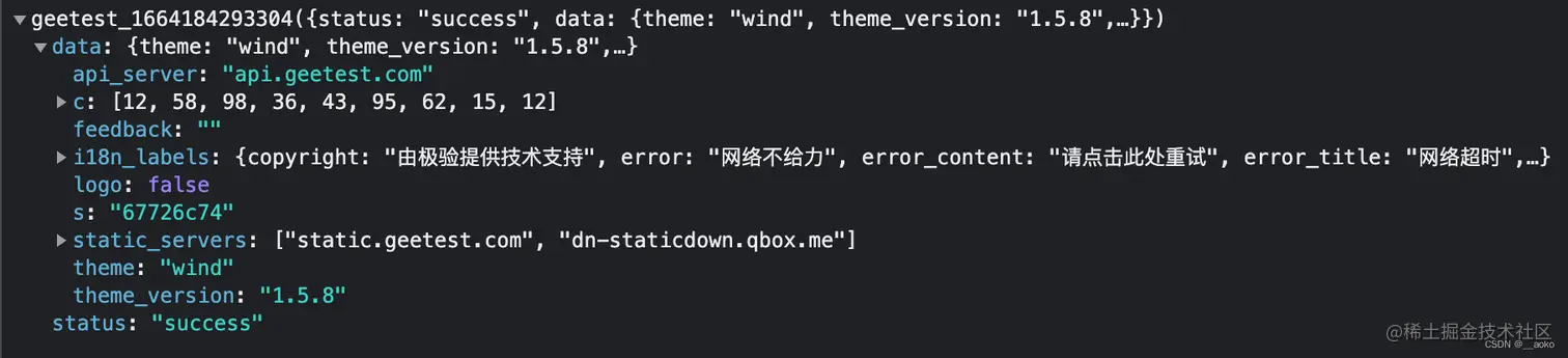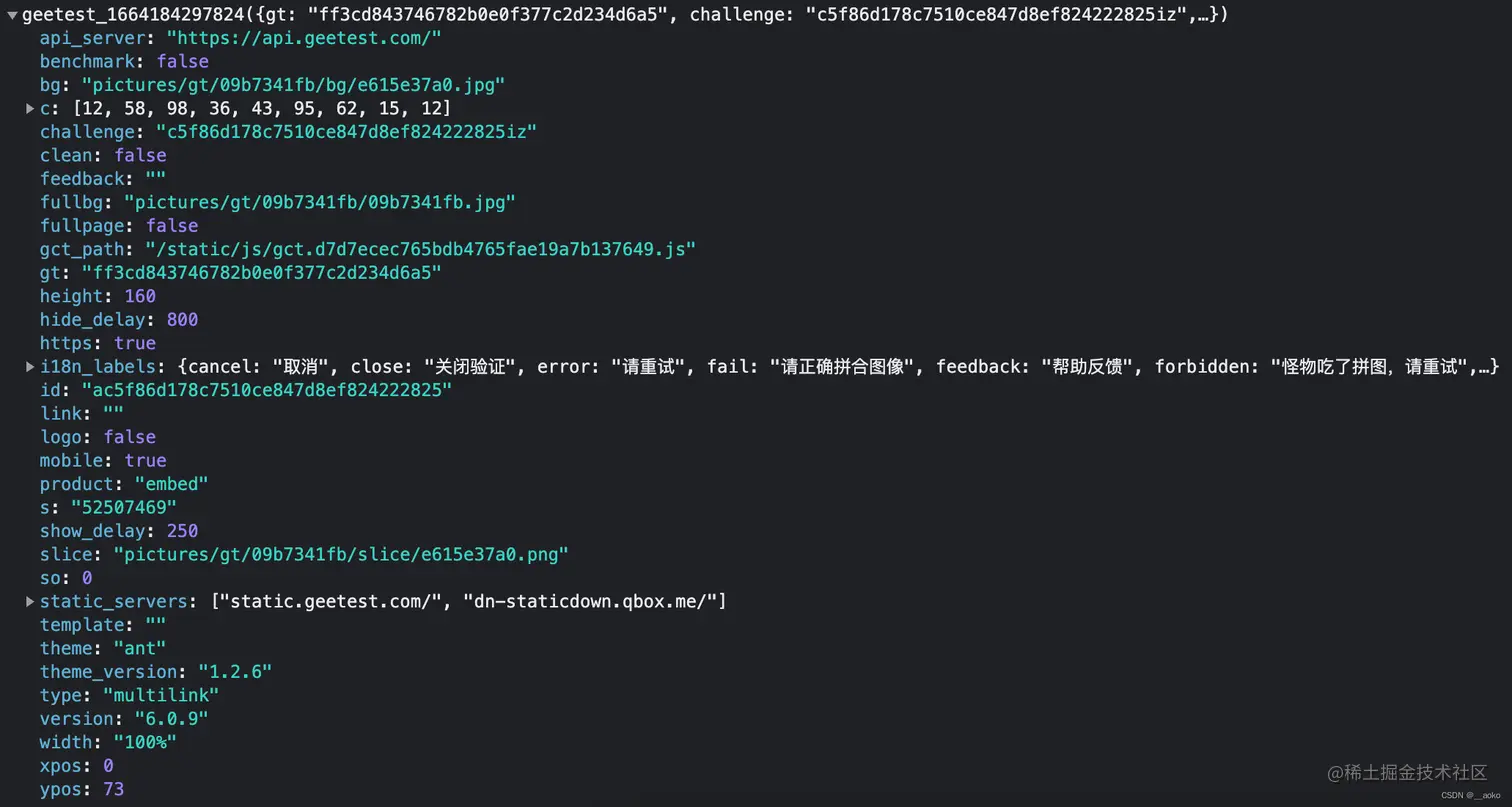 请求里有两个参数:gt 和 challenge,这两个参数非常重要,后续的请求也都会携带他们,极验通过这两个参数来标识你在做什么操作,以及后续还需什么流程。