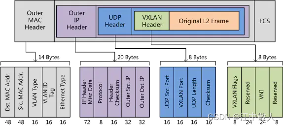 为了实现这一点,VxLAN 将第 2 层以太网帧封装在 VxLAN 数据包中,该数据包也封装在 IP UDP 标头中。下图显示了 VxLAN 数据包格式。