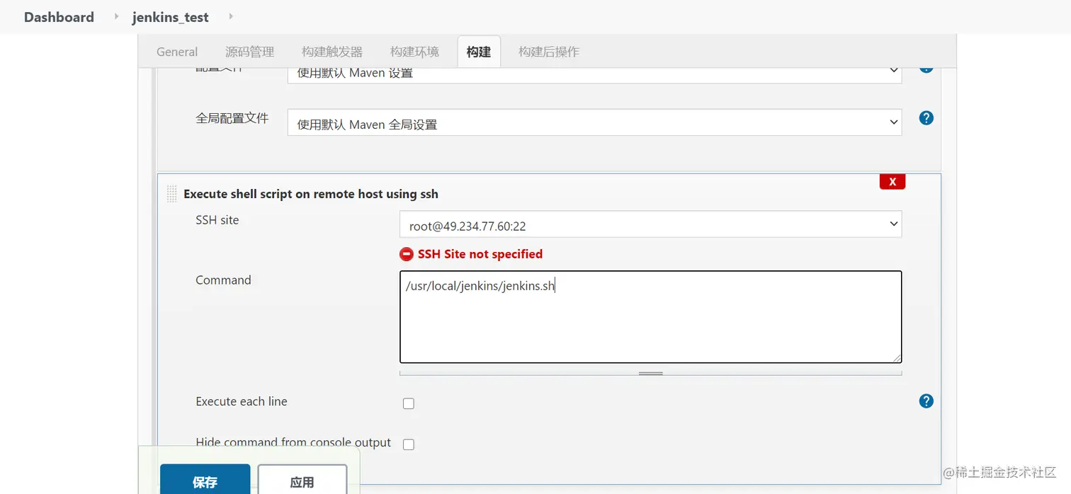 然后在添加一个构建,选Execute shell script on remote host using ssh,目的是为了执行刚才我们写的jenkins.sh脚本