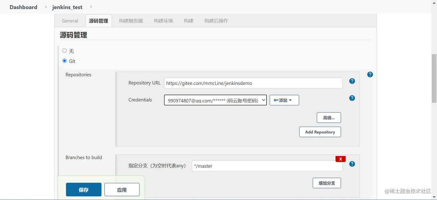 然后选择源码管理,填入源码仓库地址