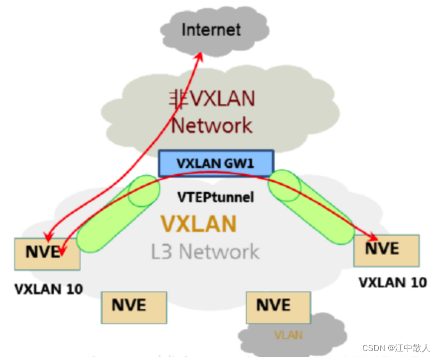 - NVE也可以是一台支持VXLAN的接入交换机集中为多租户提供VXLAN网关服务。