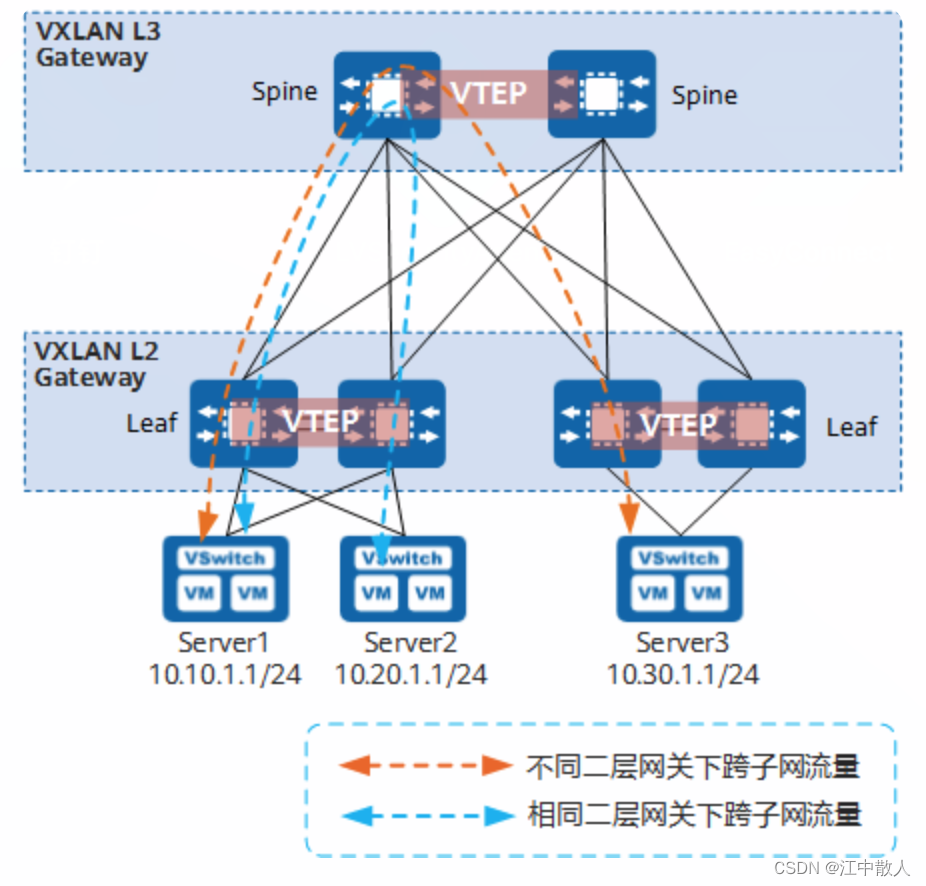 - 同一个Leaf节点既可以做VXLAN二层网关,也可以做VXLAN三层网关,部署灵活。