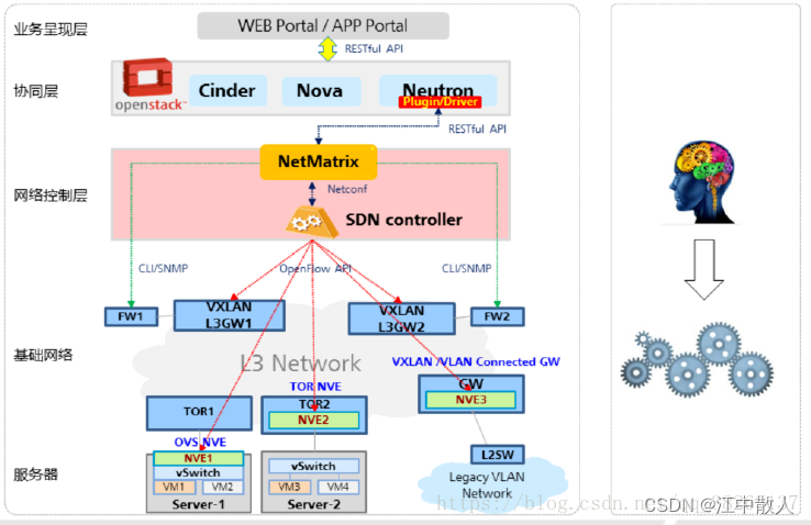 - 网络控制层:网络控制平台由NetMatrix和SNC组成,完成网络建模和网络实例化。北向支持开放API接口,实现业务快速定制和自动发放。南向支持OpenFlow/Netconf等接口,实现统一管理和控制物理和虚拟网络。