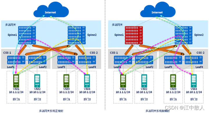 - 当多活网关系统故障时(Spine1故障),VM1与VM4之间互访的流量、VM1与Internet之间互访的流量,全部切换到Spine2进行转发,从而实现了流量的不间断,提升了核心层的可靠性。
