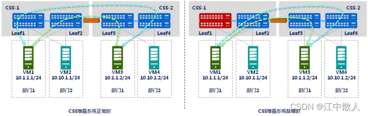 - 当CSS系统故障时(Leaf1故障),VM1与VM3之间互访的流量,全部切换到CSS-1堆叠系统中的Leaf2进行转发,从而实现了流量的不间断,提升了接入层的可靠性。