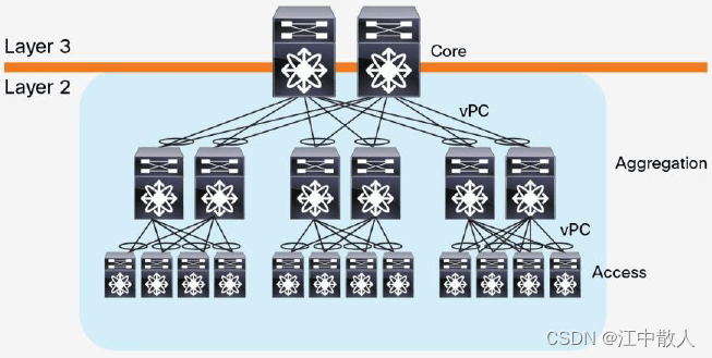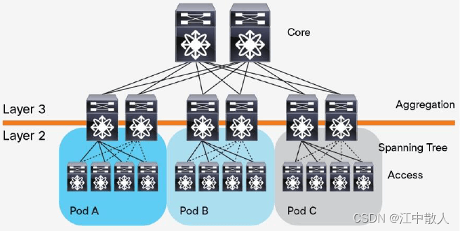 胖树架构被引入到数据中心之后,数据中心变成了传统的三层结构: