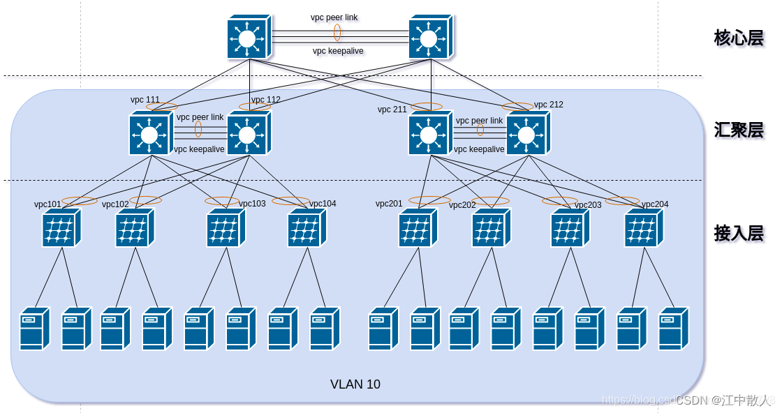 - 核心层: 用于汇聚层的的互联,并实现整个数据中心与外部网络的三层通信。此层的核心交换机为进出数据中心的包提供高速的转发,为多个二层局域网(VLAN)提供连接性,核心交换机为通常为整个网络提供一个弹性的三层网络。