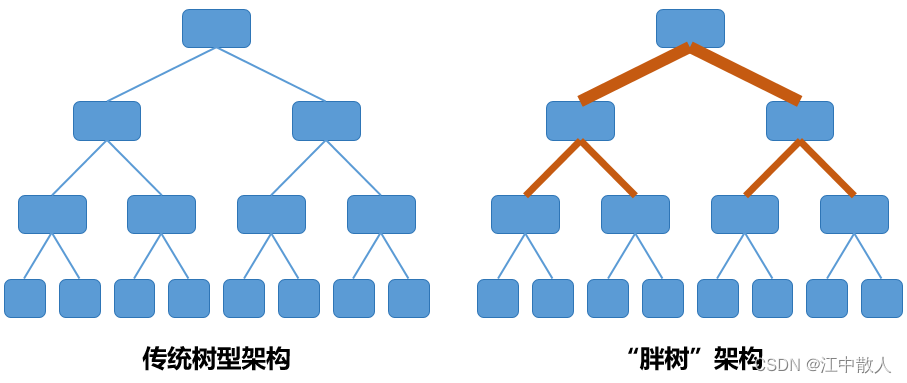 相比于传统树型,胖树(Fat-Tree)更像是真实的树,越到树根,枝干越粗。从叶子到树根,网络带宽不收敛。