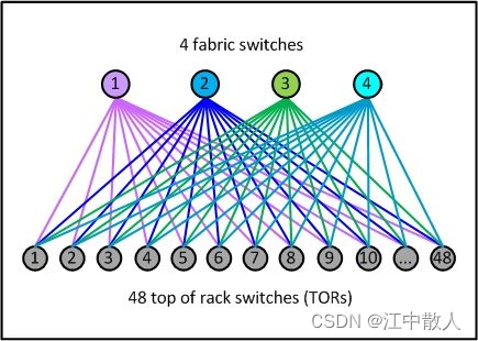 在以上两级 Clos 架构中,每个低层级的交换机(leaf)都会连接到每个高层级的交换机 (spine),形成一个 full-mesh 拓扑。leaf 层由接入交换机组成,用于连接服务器等设备。spine 层是网络的骨干(backbone),负责将所有的 leaf 连接起来。 fabric 中的每个leaf都会连接到每个spine,如果一个spine挂了,数据中心的吞吐性能只会有轻微的下降(slightly degrade)。