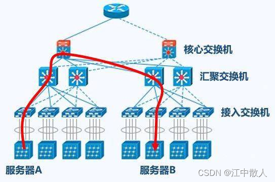 东西向流量,其实也就是一种“内部流量”。这种数据流量的大幅增加,给传统三层架构带来了很大的麻烦——因为服务器和服务器之间的通信,需要经过接入交换机、汇聚交换机和核心交换机。