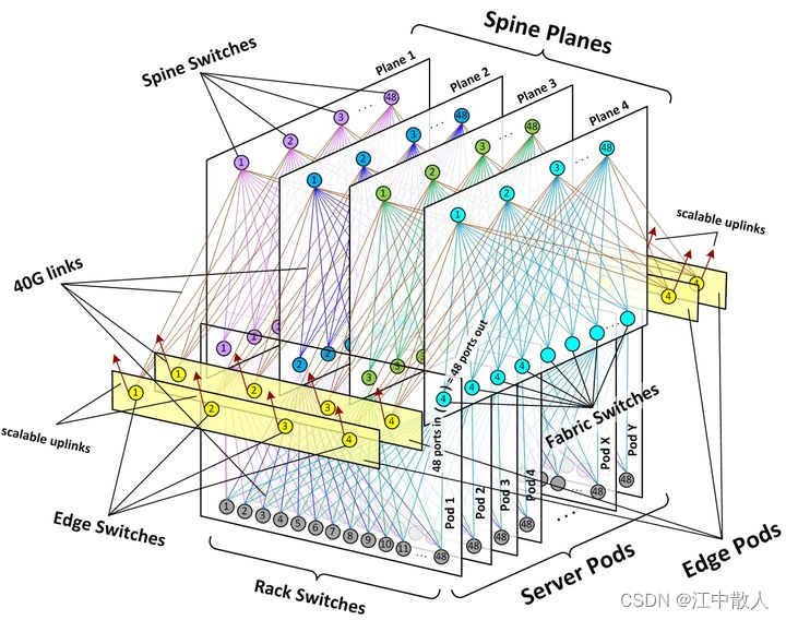 在这种架构中,我们的Spine-Leaf 网络是其中的一个POD, 我们的SPINE是图中的Fabric Switches,我们的leaf是图中的Rack Switches,最上面的Spine Switches把各个POD连通起来。当一个POD的容量已满时,可以增加POD,并用spine将这些POD连通起来,实现了网络的继续扩展。除了前面描述的POD和spine,上图中还有黄色的Edge Plane,这是为数据中心提供南北向流量的模块。它们与spine交换机的连接方式,与前文中简单的的Spine-Leaf 架构一样。并且它们也是可以水平扩展的。