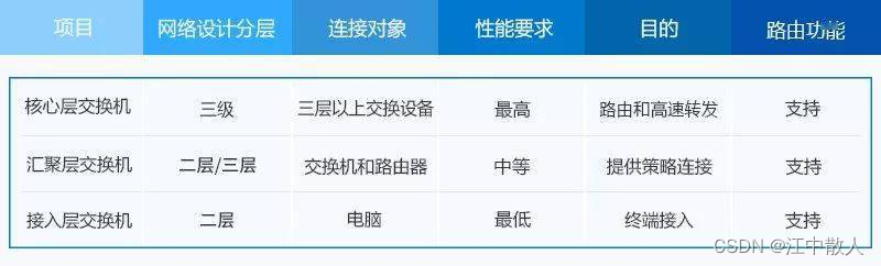 - 汇聚层:用于接入层的互联,并作为该汇聚区域二三层的边界。汇聚交换机连接同一个二层网络(VLAN)下的接入交换机,同时提供其他的服务,例如防火墙,SSL offload,入侵检测,网络分析等, 它可以是二层交换机也可以是三层交换机。