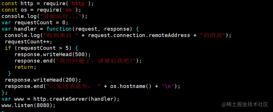 我们对这个程序稍作修改,在第5个请求之后,为每个请求返回一个500 Internal Server Error状态码。该程序会正确地处理前五个客户端请求,后续的请求都会返回错误码。由于添加了存活探针 ,在返回错误后,应用应该会被重新启动,使其能够再次正确地处理客户端请求。