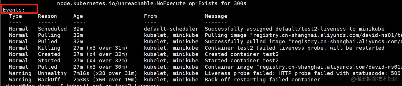 通过执行kubectl describe命令,我们可以看到容器为什么会被重启: