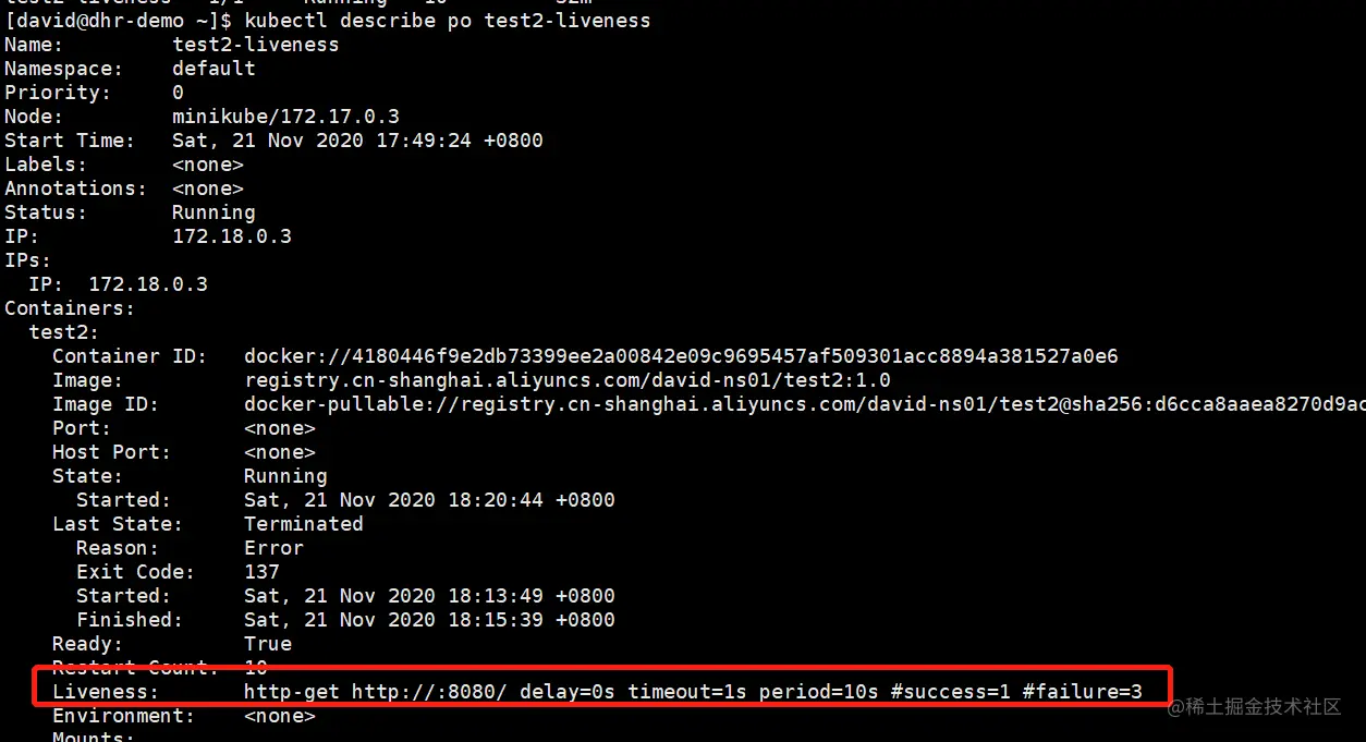 除了我们显示地指定存活探针选项,还可以看到一些附加的属性,比如delay、timeout、period等等。delay=0s表示容器启动后就立即开始探测。