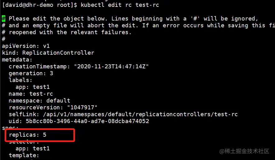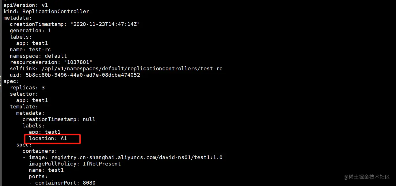 执行上面的命令后,我们就可以编辑ReplicationController的YAML定义文件。找到pod的template区段,在metadata下面添加一个额外的标签location=A1: